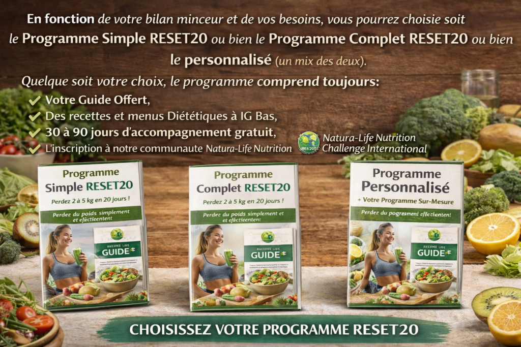 En fonction de votre bilan minceur et de vos besoins, vous pourrez choisir soit le Programme Simple RESET20 ou bien le Programme Complet RESET20 ou bien le personnalisé (un mix des deux).